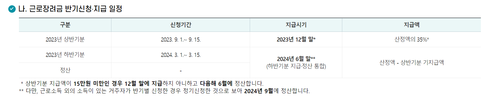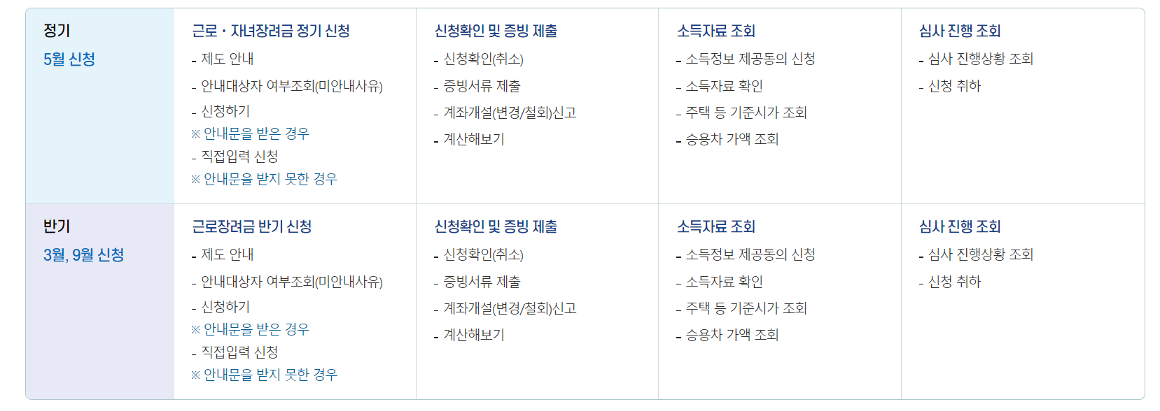 근로장려금은 근로소득자에 한하여 당해연도 소득을 기준으로 신청하는것으로 3월 9월에는 반기 5월에는 정기신청을 할 수 있어요